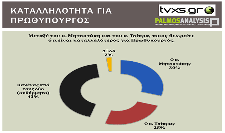 Στο ερώτημα ποιός είναι ο καταλληλότερος για πρωθυπουργός, ο Κυριάκος Μητσοτάκης προηγείται με 30% εναντι 25% του Αλέξη Τσίπρα. «Κανένας από τους δύο» απαντά αυθόρμητα το 43%, ενώ το 2% δηλώνει «δεν ξέρω/ δεν απαντώ».