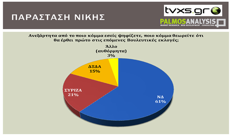 Στην παράσταση νίκης, η ΝΔ προηγείται με 61%, ο ΣΥΡΙΖΑ εμφανίζει ποσοστό 21%, ενώ το 3% βλέπει πρώτο «άλλο κόμμα» (αυθόρμητη απάντηση) και το 15% δηλώνει «δεν ξέρω/ δεν απαντώ».