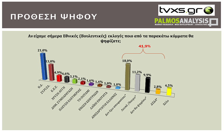 Αναποφάσιστο δηλώνει το 18% των ερωτηθέντων, Λευκό ή άκυρο επιλέγει το 11,2%, ενώ το 9,9% δηλώνει ότι «δεν θα ψηφίσει». «Δεν ξέρω/ Δεν απαντώ» δηλώνει το 2,8% των ερωτηθέντων, ενώ «άλλο κόμμα» επιλέγει το 4,5%. Συνολικά, το ποσοστό της αδιευκρίνιστης ψήφου ανέρχεται στο 41,9%.