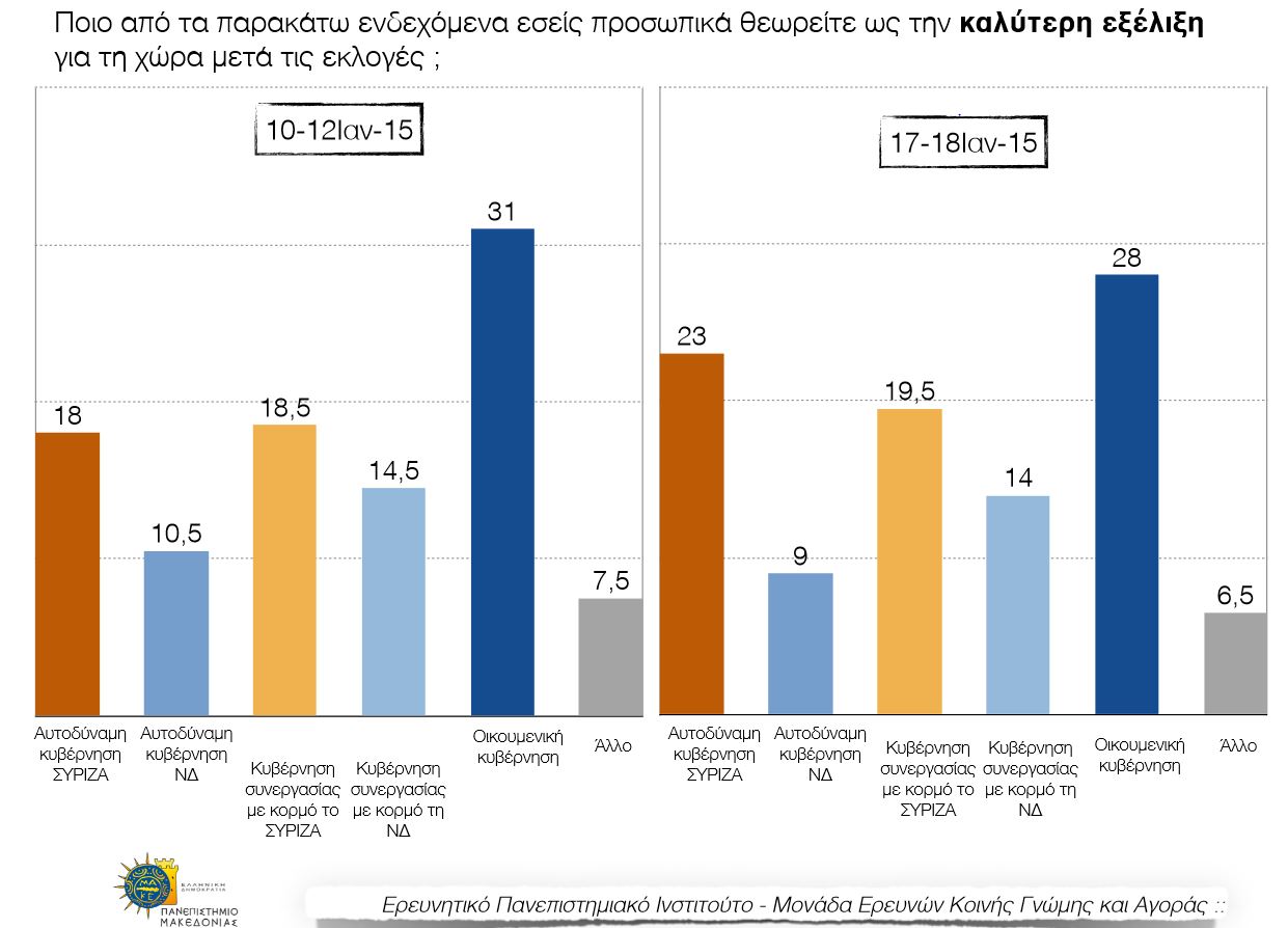 Προβάδισμα 6,5% στον ΣΥΡΙΖΑ έναντι της ΝΔ δίνει η δημοσκόπηση του Πανεπιστημίου Μακεδονίας για λογαριασμό του ΣΚΑΙ.