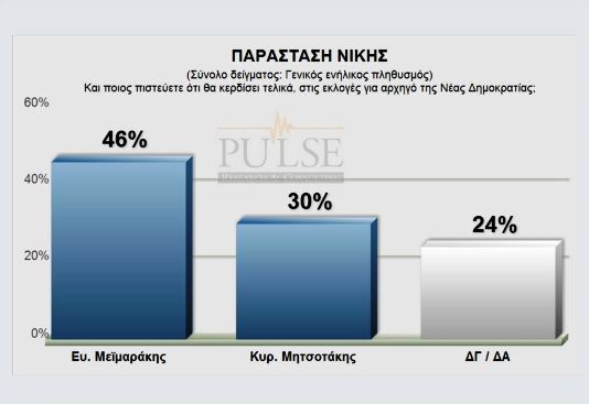 Συγκεκριμένα, στην παράσταση νίκη ο Βαγγέλης Μεϊμαράκης συγκεντρώνει 46% και ο Κυριάκος Μητσοτάκης 30%.