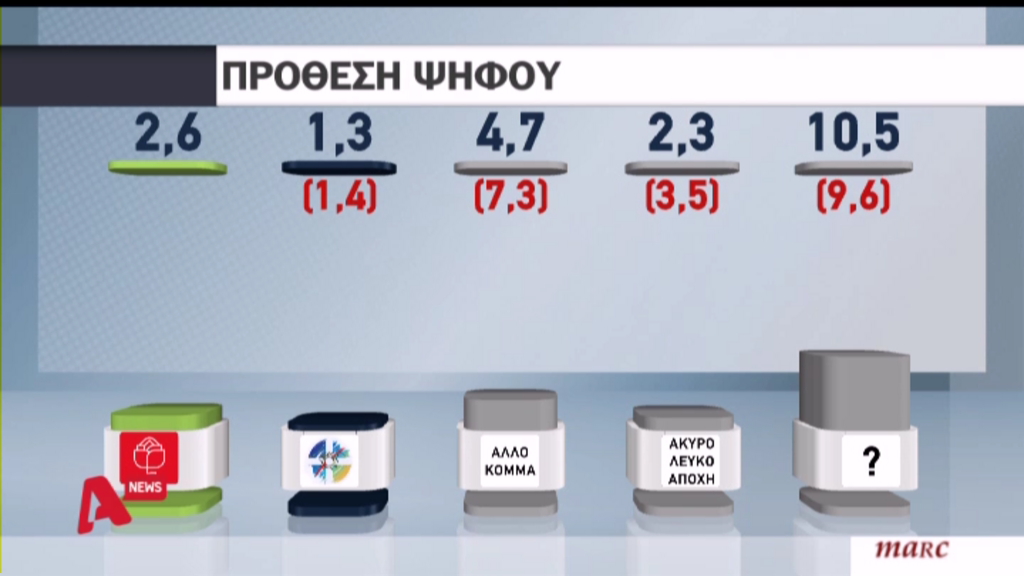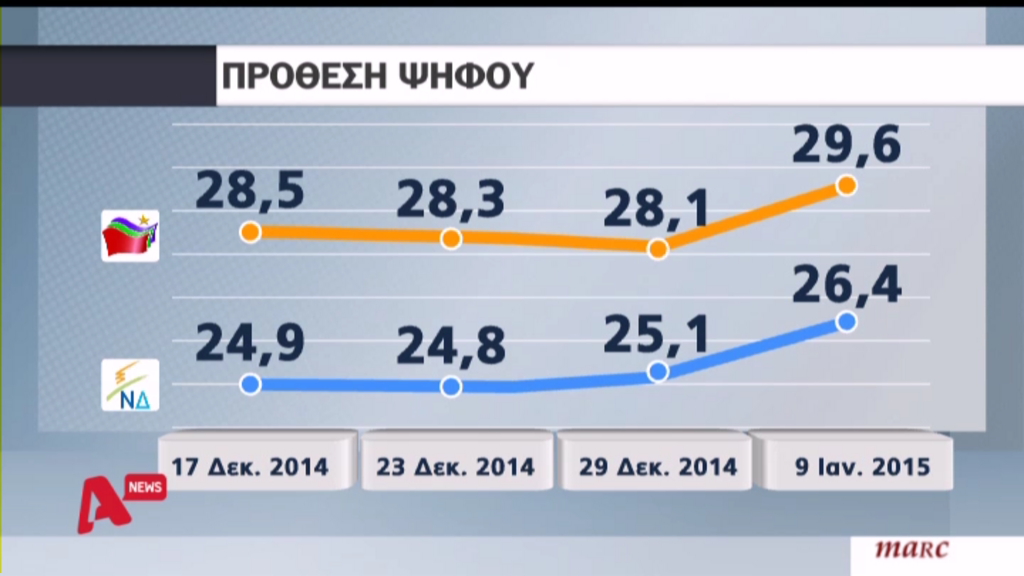 Προβάδισμα 3,2% στον ΣΥΡΙΖΑ έναντι της ΝΔ δίνει η δημοσκόπηση της εταιρείας Marc για τον ALPHA.