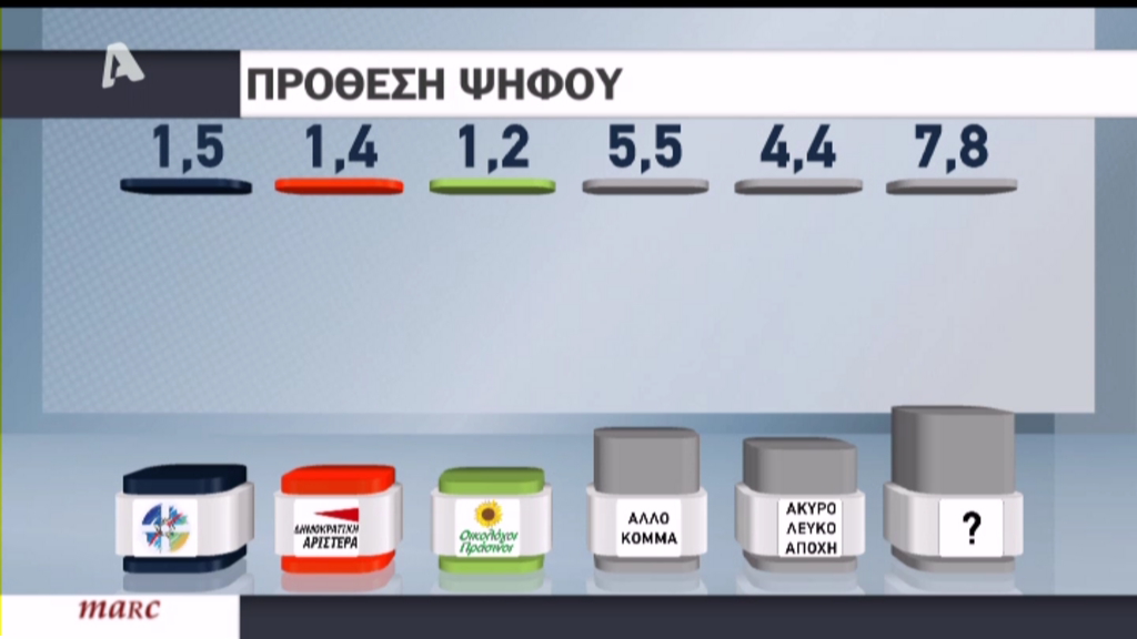 Προβάδισμα του ΣΥΡΙΖΑ με 3,6% έναντι της ΝΔ στην πρόθεση ψήφου, σύμφωνα με δημοσκόπηση που πραγματοποίησε η εταιρία Marc για λογαριασμό του τηλεοπτικού σταθμού Alpha.