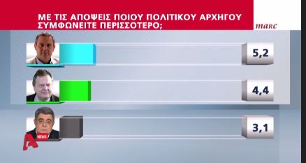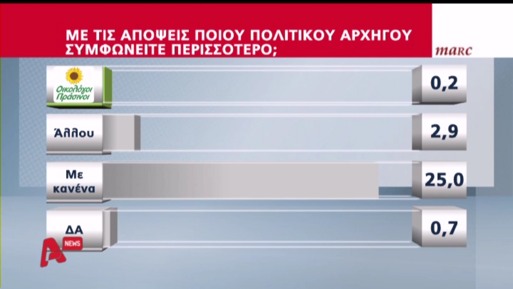 Στην ερώτηση “με τις απόψεις ποιου πολιτικού αρχηγού συμφωνείτε περισσότερο” τα ευρήματα είναι εντυπωσιακά, αφού το 25% απαντά με … κανένα.