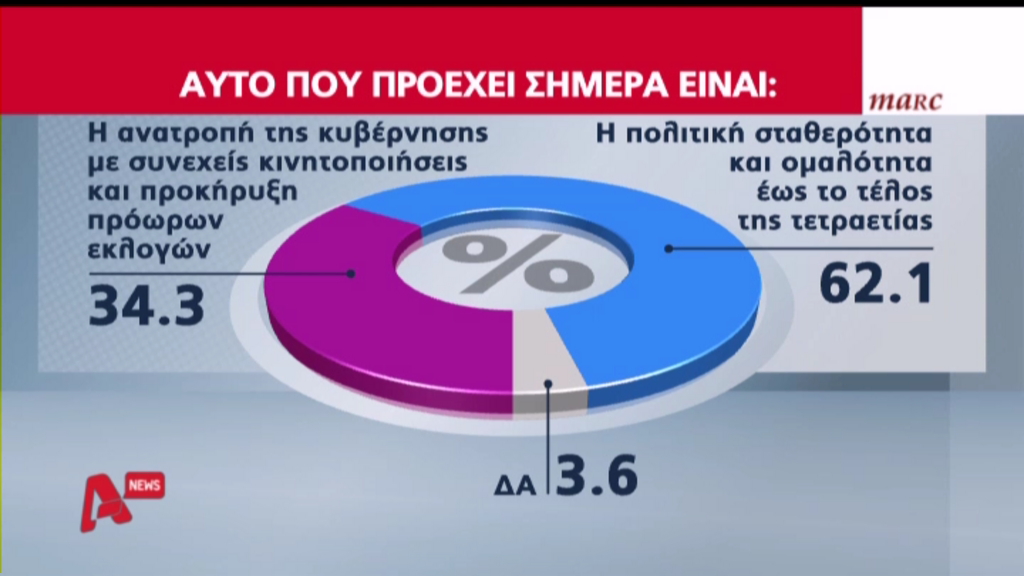 Πάντως η πλειοψηφία των πολιτών δεν επιθυμεί την διεξαγωγή εκλογών. Είναι ενδεικτικό ότι το 62,1% απαντά ότι αυτό που προέχει σήμερα είναι η πολιτική σταθερότητα και ομαλότητα έως το τέλος της τετραετίας, ενώ το 34,3 % προκρίνει την ανατροπή της κυβέρνησης με συνεχείς κινητοποίησεις και προκήρυξη πρόωρων εκλογών.