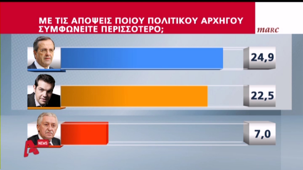 Το 24,9% συμφωνεί με τις απόψεις του Πρωθυπουργού Αντώνη Σαμαρά , ενώ το 22,5 % με αυτές του προέδρου του ΣΥΡΙΖΑ Αλέξη Τσίπρα.