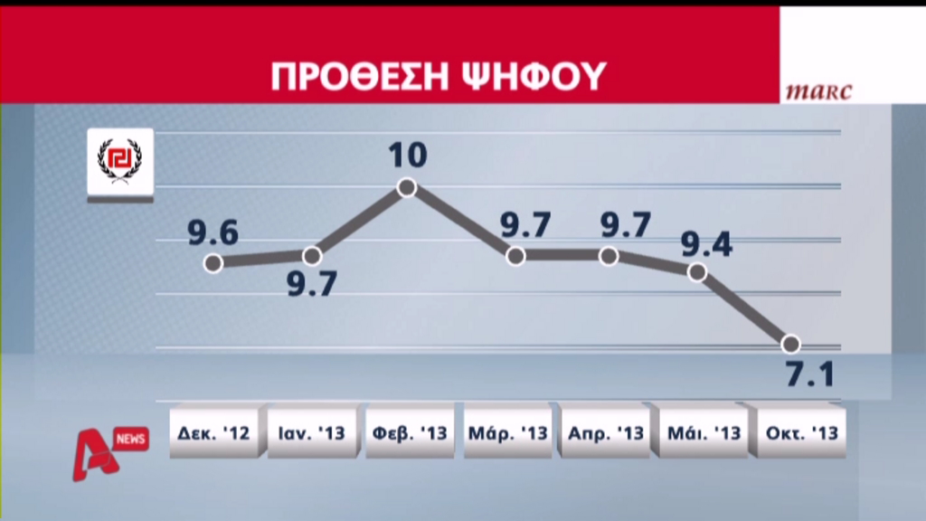 Στην παρακάτω κάρτα φαίνεται ξεκάθαρα η πτωτική δημοσκοπική πορεία της Χρυσής Αυγής από τον περασμένο Φεβρουάριο μέχρι και σήμερα.