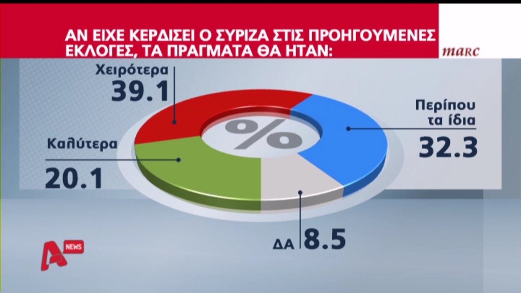 Την ίδια στιγμή, το 39,1 % θεωρεί ότι τα πράγματα θεωρεί θα ήταν χειρότερα αν είχε κερδίσει ο ΣΥΡΙΖΑ στις προηγούμενες εκλογές. Τα πράγματα θα ήταν “περίπου τα ίδια” πιστεύει το 32,3% και καλύτερα το 20,1%.