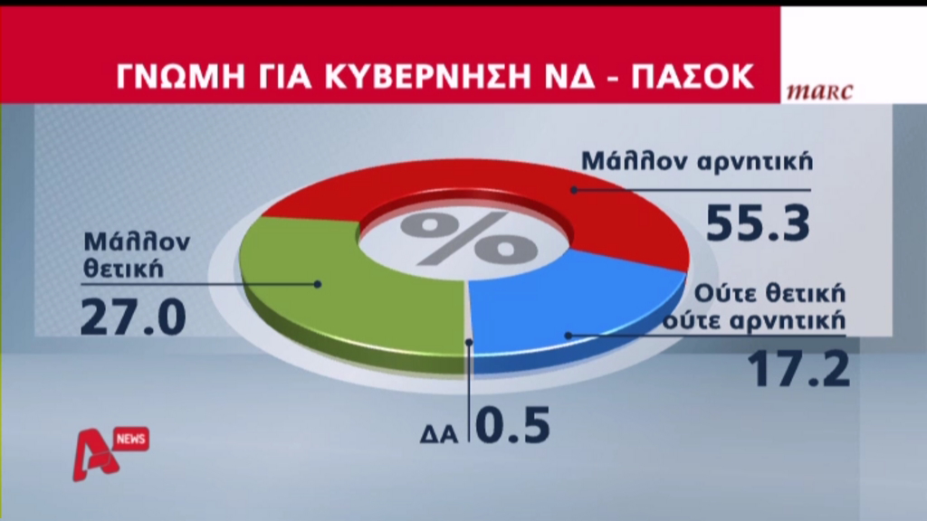 Επίσης, περισσότεροι από τους μισούς και συγκεκριμένα το 55,3% έχει μάλλον αρνητική γνώμη για την κυβέρνηση ΝΔ και ΠΑΣΟΚ, ενώ μάλλον θετική γνώμη έχει το 27%.