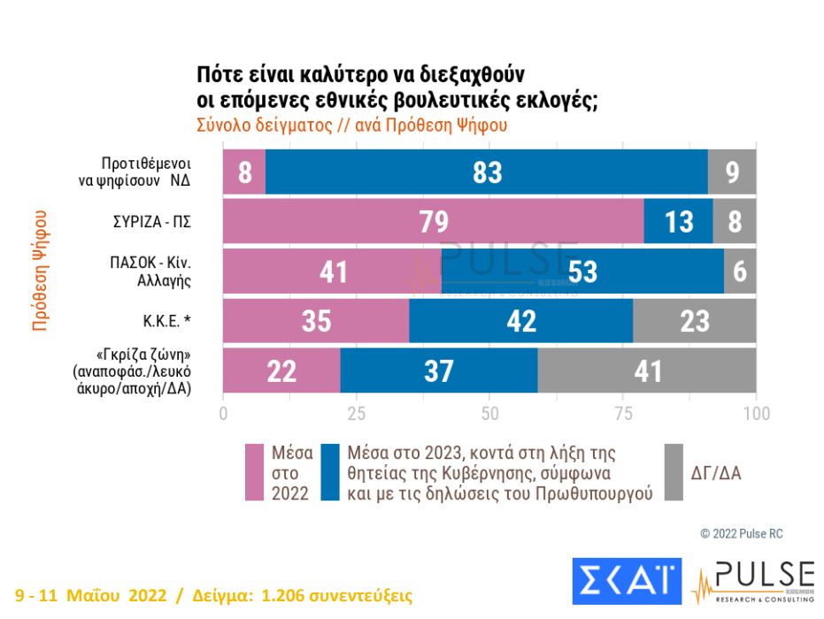 Σε ερώτημα σχετικά με το πότε είναι καλύτερο να διεξαχθούν οι επόμενες εκλογές, το 46% απάντησε το 2023, το 41% εντός του 2022 και το 13% “ΔΞ/ΔΑ”. Σύμφωνα με τα στοιχεία της δημοσκόπησης, εκείνοι που θέλουν άμεσα εκλογές είναι κυρίως οι ψηφοφόροι του ΣΥΡΙΖΑ.