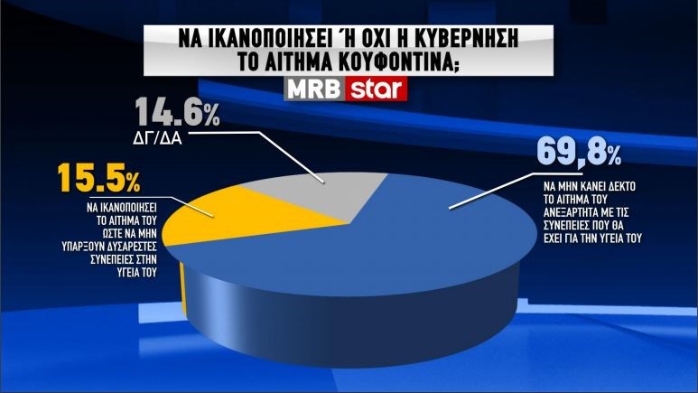 Το 69,8% ζητεί να μην γίνει δεκτό το αίτημα Κουφοντίνα για μεταγωγή στον Κορυδαλλό, ενώ το 15,5% ζητεί από την κυβέρνηση να ικανοποιήσει το αίτημά του ώστε να μην υπάρξουν δυσάρεστες συνέπειες στην υγεία του. Ταυτόχρονα υπάρχει και ένα 14,6% που τοποθετείται με το «δεν γνωρίζω/δεν απαντώ».