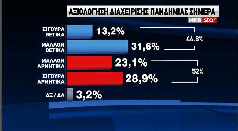 Το 52% κρίνει αρνητικά ή μάλλον αρνητικά τον τρόπο διαχείρισης της πανδημίας από την κυβέρνηση, ενώ το 44,8% απαντά πως οι χειρισμοί της κυβέρνησης κινούνται σε θετική κατεύθυνση.