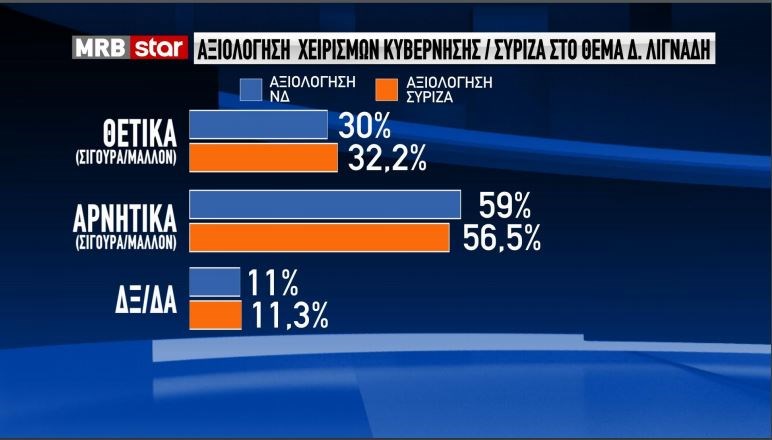 Το 59% κρίνει αρνητικά τη στάση της κυβέρνησης απέναντι στην υπόθεση Λιγνάδη, ενώ το 30% την κρίνει θετικά.