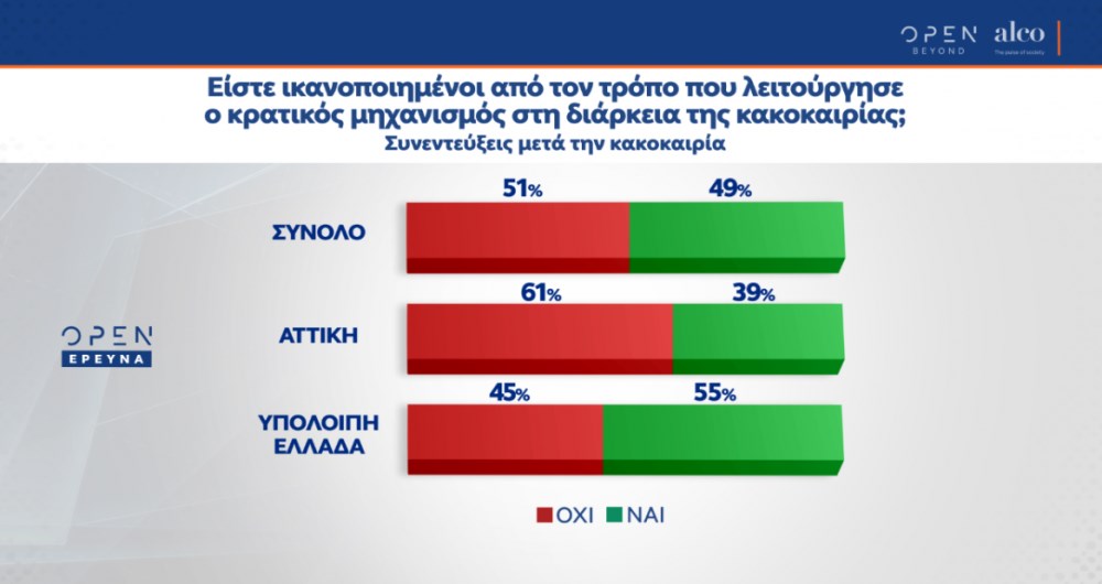 Στην ερώτηση για τον τρόπο που αντιμετώπισε ο κρατικός μηχανισμός την κακοκαιρία “Μήδεια”, το 51% των ερωτηθέντων απάντησε αρνητικά έναντι του 49% που απάντησε θετικά.