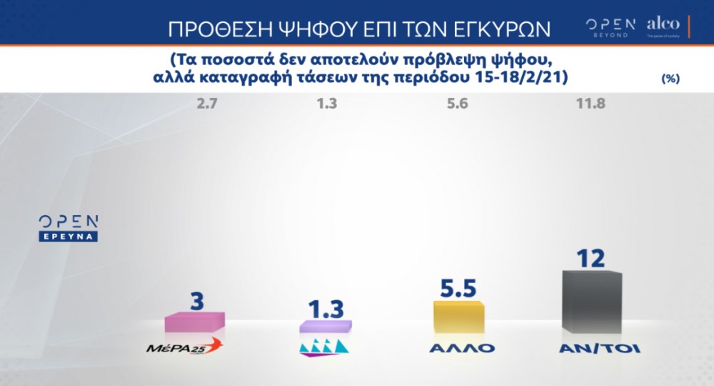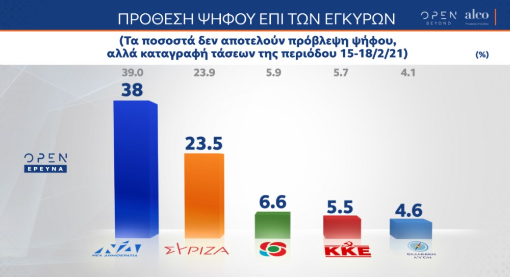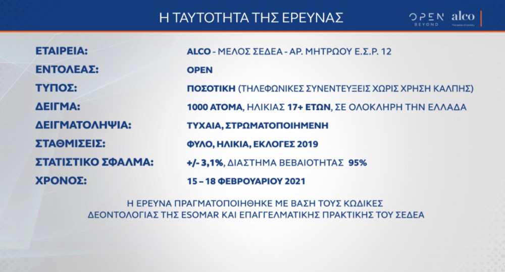 Διψήφιο προβάδισμα διατηρεί η ΝΔ έναντι του ΣΥΡΙΖΑ σύμφωνα με τα ευρήματα της δημοσκόπησης της ALCO για λογαριασμό του κεντρικού δελτίου ειδήσεων του OPEN. Σύμφωνα με τη δημοσκόπηση, η συντριπτική πλειονότητα των πολιτών ζητάει να αλλάξει η νομοθεσία και να μην παραγράφεται το αδίκημα του βιασμού και της σεξουαλικής παρενόχλησης. Πώς έκριναν οι πολίτες τη διαχείριση της κακοκαιρίας «Μήδεια» που έπληξε τη χώρα μας. Είναι ικανοποιημένοι από την κυβέρνηση για το σχεδιασμό και την υλοποίηση του προγράμματος εμβολιασμών;