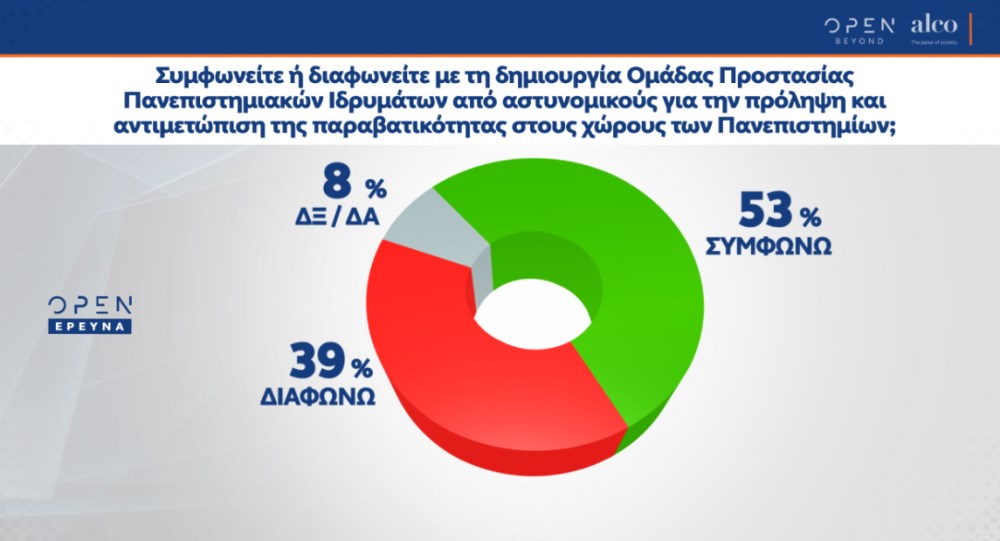 Τέλος, η πλειοψηφία των πολιτών συμφωνεί με την είσοδο της αστυνομίας στα ελληνικά πανεπιστήμια, αν και εκτιμά ότι η εφαρμογή του μέτρου αυτού είναι λεπτό ζήτημα.
