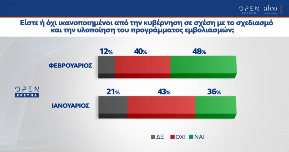 Σχετικά με το κυβερνητικό σχέδιο για τους εμβολιασμούς κατά του κορονοϊού, το ποσοστό ικανοποίησης αυξήθηκε τον Φεβρουάριο.