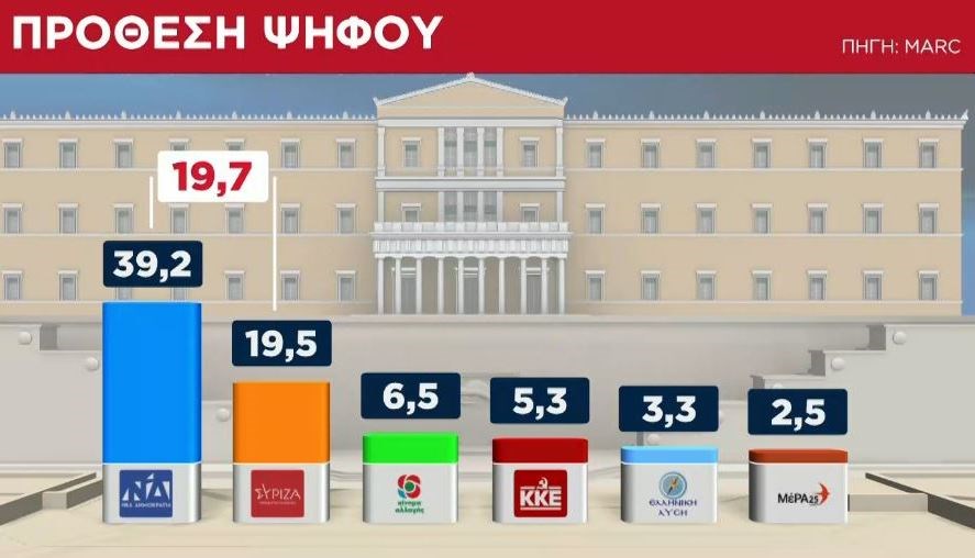 Στην πρόθεση ψήφου, η ΝΔ προηγείται του ΣΥΡΙΖΑ με 19,7 μονάδες. Συγκεκριμένα, η ΝΔ συγκεντρώνει ποσοστό 39,2%, ενώ ο ΣΥΡΙΖΑ καταγράφει ποσοστό 19,5%. Ακολουθούν το Κίνημα Αλλαγής με 6,5%, το ΚΚΕ με 5,3%, η Ελληνική Λύση με 3,3% και το ΜέΡΑ25 με 2,5%.