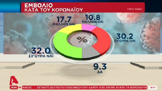 Σκοπεύουν οι πολίτες να κάνουν το εμβόλιο κατά του κορονοϊού, όταν αυτό θα είναι διαθέσιμο. Οι ερωτηθέντες στη δημοσκόπηση, απάντησαν ως εξής: Το 32% “σίγουρα ναι”, το 30,2% “σίγουρα όχι”, το 17,7% “μάλλον ναι”, το 10,8% “μάλλον όχι”, ενώ το 9,3% δεν απαντά.