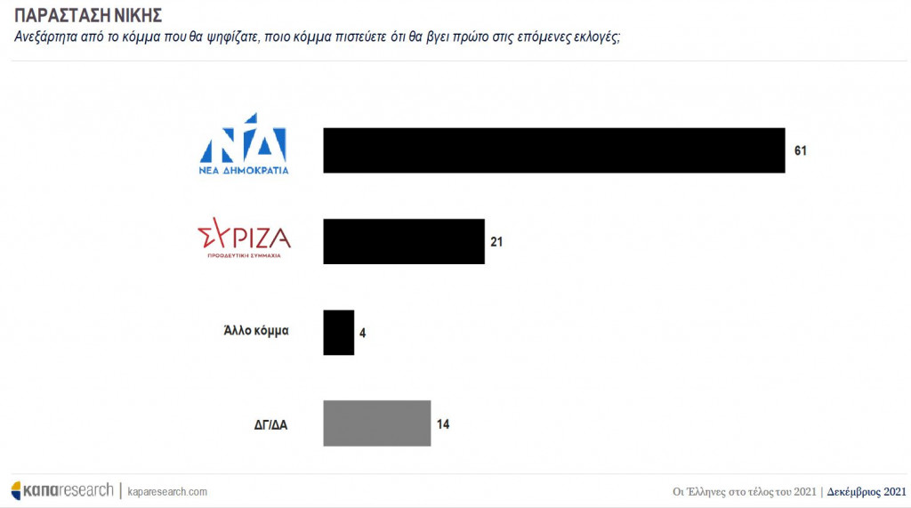 Στην παράσταση νίκης και στην ερώτηση «ανεξάρτητα από το κόμμα που θα ψηφίζατε, ποιο κόμμα πιστεύετε ότι θα είναι πρώτο στις επόμενες εκλογές», το 61% απάντησε Νέα Δημοκρατία, το 21% απάντησε ΣΥΡΙΖΑ και το 4% άλλο κόμμα.