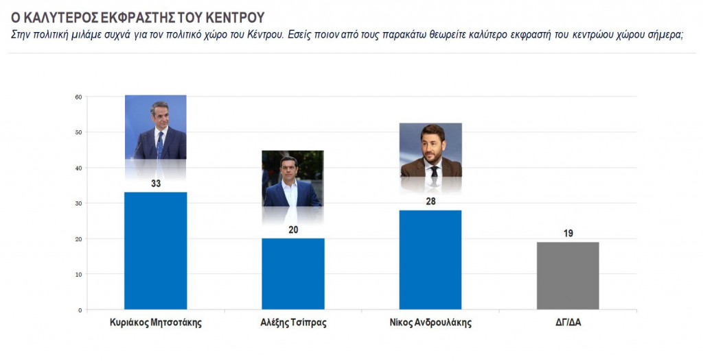 Στη «μάχη του κέντρου», φαίνεται να διατηρεί τις δυνάμεις του ο Κυριάκος Μητσοτάκης με δυναμική είσοδο, όμως, του Νίκου Ανδρουλάκη στην εξίσωση. Ο πρωθυπουργός θεωρείται «ο καλύτερος εκφραστής του κεντρώου χώρου σήμερα» για το 33% όσων συμμετείχαν στην έρευνα, ενώ ο πρόεδρος του ΚΙΝΑΛ για το 28%. Ένα 20% θεωρεί καλύτερο τον Αλέξη Τσίπρα.