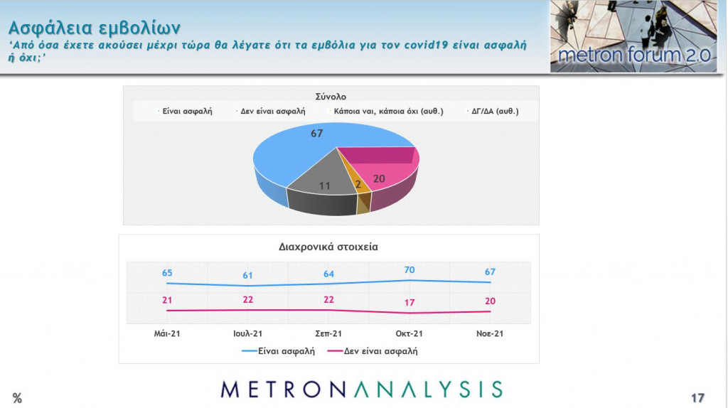 Για την ασφάλεια των εμβολίων, το 67%, δηλαδή 2 στους 3, δηλώνουν ότι είναι ασφαλή και το 20% ότι δεν είναι.