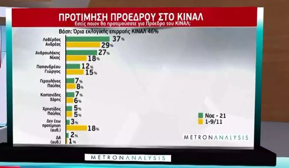 Ο Ανδρέας Λοβέρδος οδηγεί την κούρσα με 37% στην κατηγορία των ψηφοφόρων από ολόκληρο το πολιτικό φάσμα που συγκροτούν την δυνητική βάση του κόμματος, ενώ ο Νίκος Ανδρουλάκης προηγείται στην εκλογική βάση του ΚΙΝΑΛ, συνυπολογιζομένων και των αναποφάσιστων που δηλώνουν ότι θα ψηφίσουν στην εκλογή ηγεσίας.