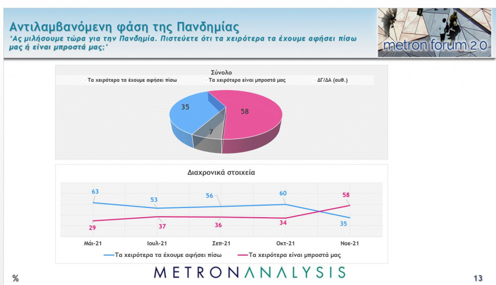 Στο ερώτημα αν έχουμε αφήσει τα χειρότερα πίσω μας ή είναι μπροστά μας, το 35% λέει ότι τα χειρότερα πέρασαν αλλά το 58% ότι είναι μπροστά μας. Είναι η αίσθηση της ανασφάλειας για την επόμενη ημέρα όσο οι πολίτες παρακολουθούν την αύξηση στα κρούσματα, τους νεκρούς, τους διασωληνωμένους.