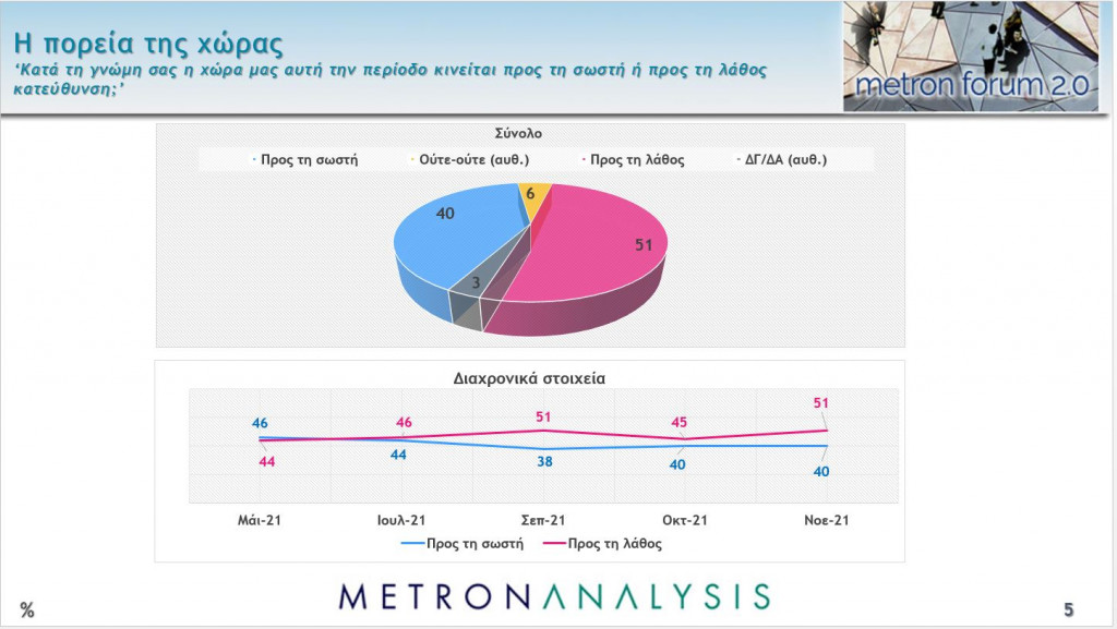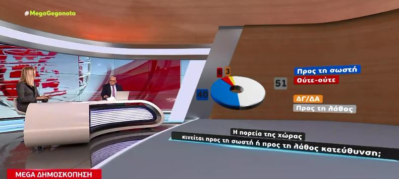 «Καμπάνα» χτυπά για τα κόμματα ως προς την πορεία της χώρας. Το 51%, μεγαλύτερο ποσοστό τους τελευταίους μήνες κρίνει ότι κινούμαστε προς τη λάθος κατεύθυνση και το 40% προς τη θετική. Οι πολίτες πιστεύουν σε ποσοστό 43% ότι είναι στην ίδια κατάσταση προσωπικά σε σχέση με ένα χρόνο πριν. Το 37%, δηλαδή ένας στους 3 λέει ότι είναι σε χειρότερο και μόλις το 20% ότι είναι σε καλύτερη.