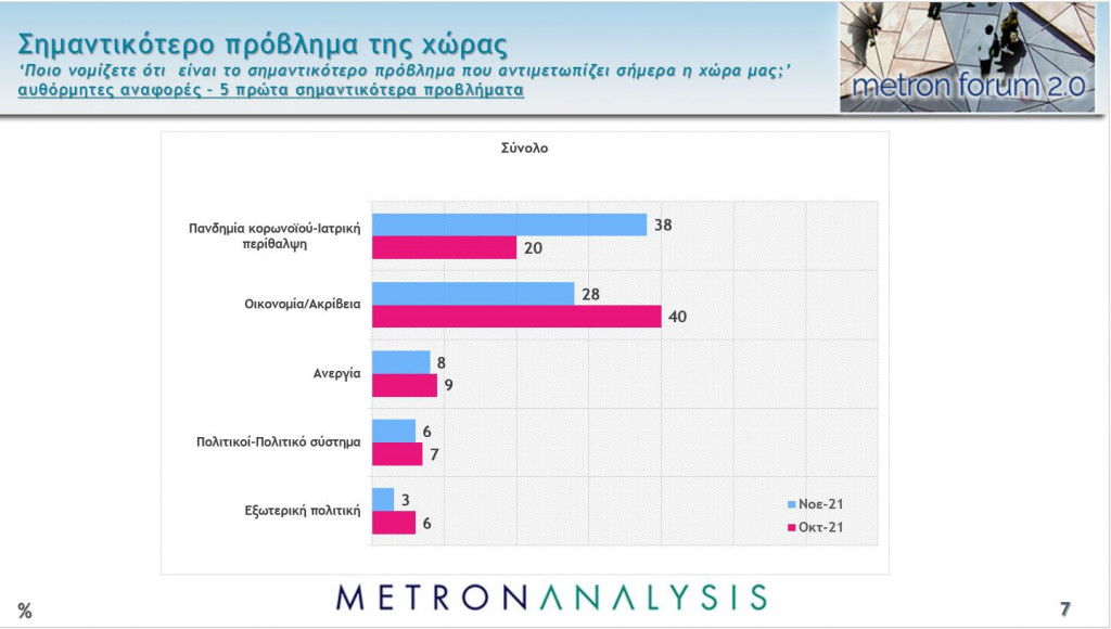 Δεύτερο πιο σοβαρό σε ποσοστό 28% κρίνουν την οικονομία – ακρίβεια όταν τον Οκτώβριο ήταν στο 40%. Ακολουθεί η ανεργία με 8%, οι πολιτικοί και το πολιτικό σύστημα με 6% και η εξωτερική πολιτική με 3%.