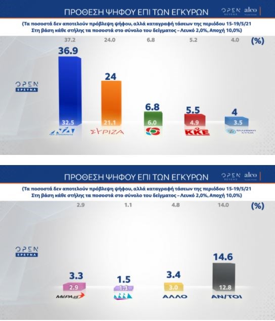Διψήφια διαφορά έναντι του ΣΥΡΙΖΑ καταγράφει η Νέα Δημοκρατία σε νέα δημοσκόπηση που πραγματοποίησε η εταιρεία Alco για λογαριασμό του Open. Σύμφωνα με τα ευρήματα της δημοσκόπησης, στην πρόθεση ψήφου επί των έγκυρων το κυβερνών κόμμα συγκεντρώνει 36,9% έναντι 24% της Αξιωματικής Αντιπολίτευσης. Στην 3η θέση είναι το ΚΙΝΑΛ με 6,8%, ακολουθεί το ΚΚΕ με 5,5%, η Ελληνική Λύση με 4%, το ΜέΡΑ25 με 3,3%, η Πλεύση Ελευθερίας με 1,5%, το “Άλλο κόμμα” με 3,4%, ενώ οι αναποφάσιστοι είναι στο 14,6%.