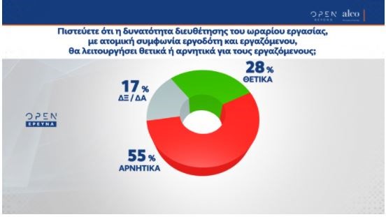 Όσο για το εργασιακό νομοσχέδιο και στο κατά πόσο θα λειτουργήσει θετικά ή αρνητικά για τον εργαζόμενο η δυνατότητα διευθέτησης του ωραρίου εργασίας με ατομική συμφωνία με τον εργοδότη, το 55% απαντά αρνητικά, το 28% το κρίνει θετικά, ενώ το 17% έχει τοποθετηθεί με το “δεν ξέρω/δεν απαντώ”.