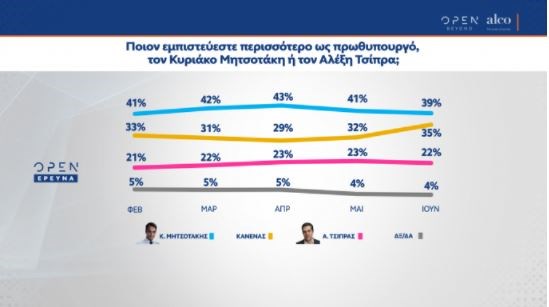 Στο ερώτημα “ποιον εμπιστεύεστε περισσότερο ως πρωθυπουργό, τον Κυριάκο Μητσοτάκη ή τον Αλέξη Τσίπρα;”, το 39% των πολιτών απάντησε τον Κυριάκο Μητσοτάκη, το 22% τον αρχηγό της Αξιωματικής Αντιπολίτευσης. Το 33% των πολιτών απάντησε «κανέναν από τους δύο», ενώ 4% τοποθετήθηκε στο “δεν ξέρω/δεν απαντώ”.