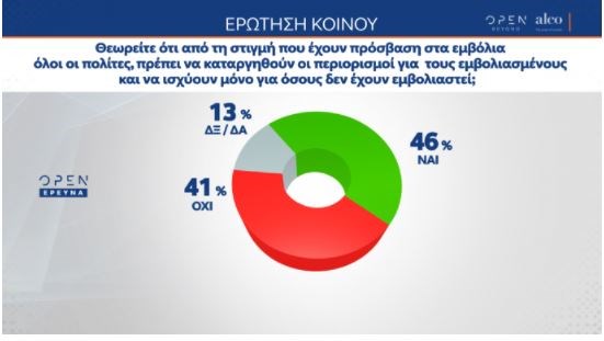 Στο ερώτημα αν από τη στιγμή που έχουν πρόσβαση στα εμβόλια όλοι οι πολίτες, πρέπει να καταργηθούν οι περιορισμοί για τους εμβολιασμένους και να ισχύσουν μόνο για όσους δεν έχουν εμβολιαστεί, το 41% των ερωτηθέντων απαντά “όχι” ενώ το 46% απαντά θετικά. Το 13% απαντά “δεν ξέρω/δεν απαντώ”.
