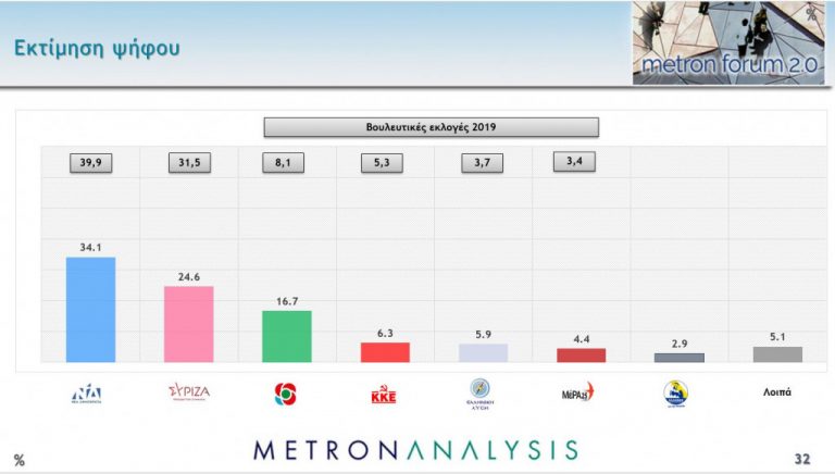Αξίζει να σημειωθεί ότι για τη ΝΔ το κατώτατο ποσοστό στην εκτίμηση ψήφου είναι 31,5% και το ανώτατο 36,7%. Για τον ΣΥΡΙΖΑ είναι 22,3% έως 26,9% και για το Κίνημα Αλλαγής 14,7% έως 18,7%.