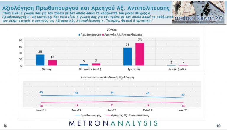 Οι θετικές γνώμες για τον πρωθυπουργό είναι 35% και οι αρνητικές στο 58%. Για τον κ. Τσίπρα οι θετικές γνώμες είναι 18% και οι αρνητικές στο 73%.
