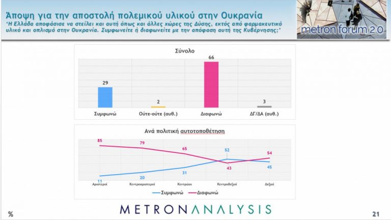 Κόλαφος για την κυβέρνηση είναι η απάντηση σχετικά με την αποστολή πολεμικού υλικού στην Ουκρανία. Το 66% διαφωνεί και το 29% συμφωνεί με την απόφαση αυτή.
