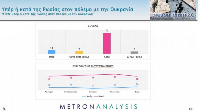 Συντριπτικά οι Έλληνες, σε ποσοστό 70% είναι κατά της Ρωσίας στον πόλεμο με την Ουκρανία και το 13% υπέρ. Βλέπουμε ότι είτε κάποιος είναι αριστερός είτε δεξιός φαίνεται να είναι αναφανδόν κατά της Ρωσίας. Μάλιστα οι κεντροδεξιοί είναι κατά σε ποσοστό 80%.