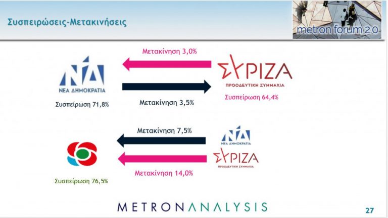 Αναφορικά με τις συσπειρώσεις – μετακινήσεις, η ΝΔ έχει συσπείρωση 71,8% με ένα 3% να μετακινείται από τον ΣΥΡΙΖΑ και ένα 3,5% να φεύγει προς την Κουμουνδούρου. Ο ΣΥΡΙΖΑ έχει συσπείρωση στο 64,4%. Όσο για το Κίνημα Αλλαγής, η συσπείρωση κινείται σε υψηλά επίπεδα, στο 76,5% και «κλέβει» ψηφοφόρους από τον ΣΥΡΙΖΑ σε ποσοστό 14% και από τη ΝΔ σε ποσοστό 7,5%.