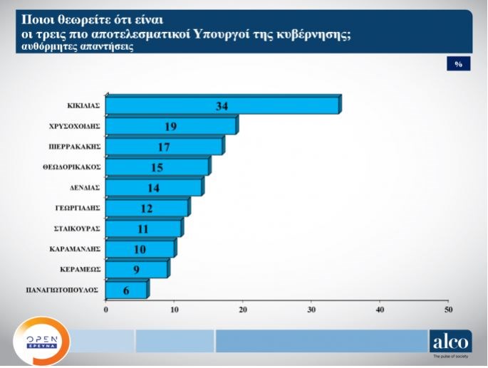 Στο ερώτημα για τους πιο αποτελεσματικούς υπουργούς, στην κορυφή είναι ο υπουργός Υγείας, Βασίλης Κικίλιας με 34%, ενώ στη 2η θέση είναι ο υπουργός Προστασίας του Πολίτη, Μιχάλης Χρυσοχοΐδης με τον υπουργό Ψηφιακής Πολιτικής, Κυριάκο Πιερρακάκη να είναι 3ος με 17%.