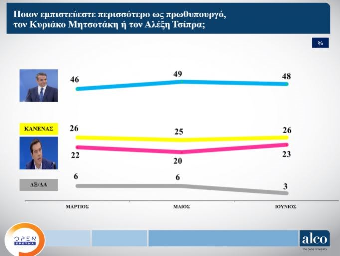 Σε ό,τι αφορά στη μάχη του Κυριάκου Μητσοτάκη και του Αλέξη Τσίπρα, ο Πρωθυπουργός συγκεντρώνει 48% έναντι 23% του προέδρου του ΣΥΡΙΖΑ, ενώ το 26% απαντά πως δεν εμπιστεύεται κανέναν, αλλά και ένα 3% “Δεν ξέρω, δεν απαντώ”.