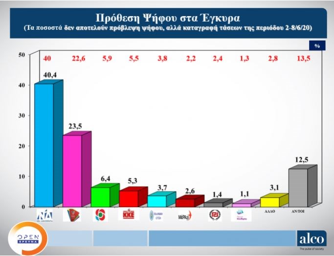 Σταθερά μεγάλη διαφορά καταγράφει η ΝΔ έναντι του ΣΥΡΙΖΑ στην πρόθεση ψήφου επί των έγκυρων σύμφωνα με νέα δημοσκόπηση της Alco που μεταδόθηκε το βράδυ της Τρίτης στο κεντρικό δελτίο ειδήσεων του Open.