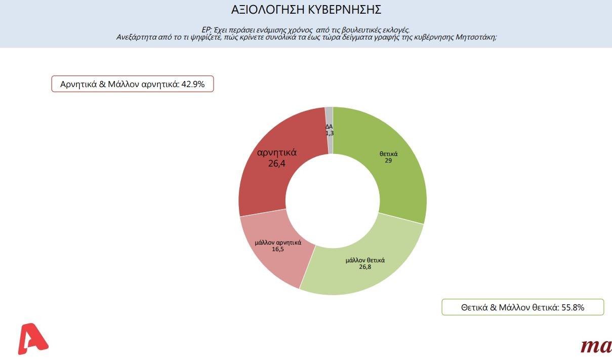 Στην αξιολόγηση της κυβέρνησης Μητσοτάκη, το 55,8% την αξιολογεί θετικά ή μάλλον θετικά, το 26,4% αρνητικά και το 16,5% μάλλον αρνητικά, ενώ 1,3% δεν απαντά.