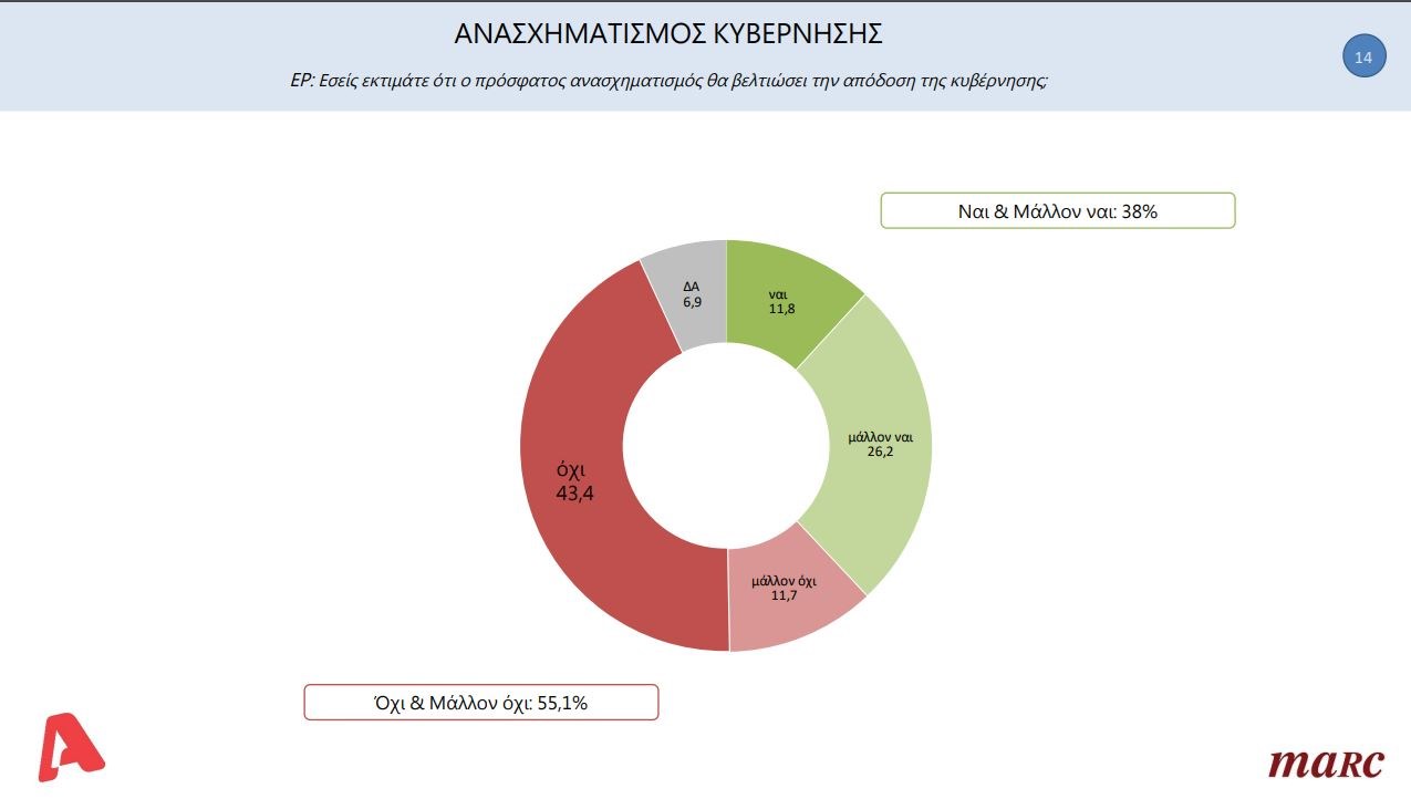 Στο ερώτημα για τον πρόσφατο ανασχηματισμό και κατά πόσο θα βελτιώσει την επίδοση και απόδοση της κυβέρνησης, το 55,1% απαντά «όχι ή μάλλον όχι», το 11,8% «ναι» και το 26,2% «μάλλον ναι».