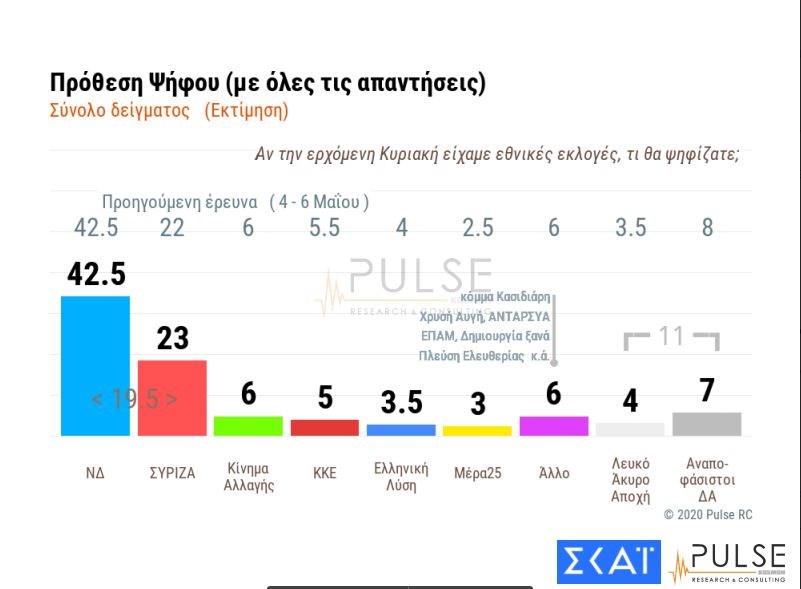 Στην ερώτηση τι θα ψήφιζαν οι πολίτες εάν την Κυριακή είχαμε εθνικές εκλογές το 42,5% των πολιτών απαντά ΝΔ, ενώ το 23% ΣΥΡΙΖΑ (από 22%). Το 6% απαντά Κίνημα Αλλαγής (σταθερό), το 5% ΚΚΕ (από 5,5%), το 3,5% Ελληνική Λύση (από 4%), το 3% θα ψήφιζε ΜέΡΑ 25 (από 2,5%), 6% δηλώνει ότι θα ψήφιζε άλλο κόμμα (σταθερό), 4% λευκό, άκυρο ή αποχή (από 3,5%). 7% των ερωτώμενων είναι αναποφάσιστοι ή δεν απαντούν (από 8%).