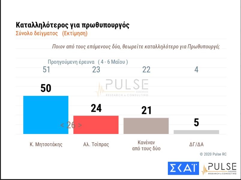 Όσον αφορά το ποιος εκ των κ. Μητσοτάκη και Τσίπρα είναι καταλληλότερος για πρωθυπουργός το 50% των ερωτώμενων απαντά ο Κυριάκος Μητσοτάκης (έναντι 51% στην προηγούμενη έρευνα), ενώ το 24% ο Αλέξης Τσίπρας (23%). 21% απαντά κανένας από τους δύο (22%). 5% δηλώνει δεν ξέρω/δεν απαντώ.