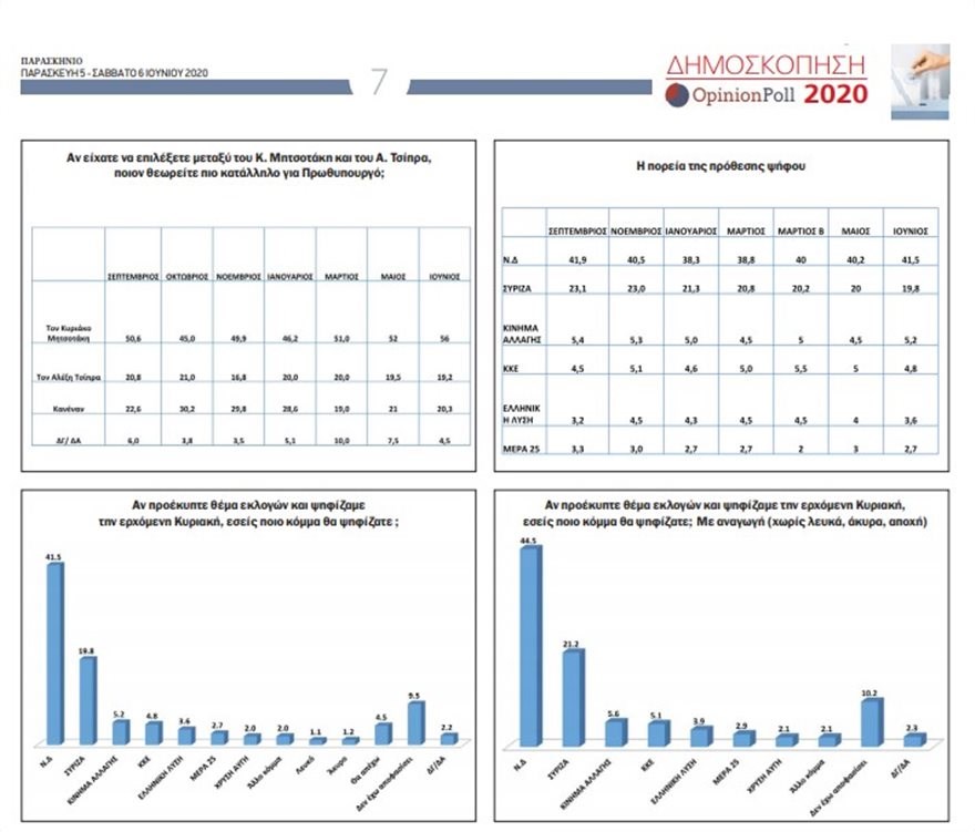 Στο ερώτημα «αν προέκυπτε θέμα εκλογών και ψηφίζαμε την ερχόμενη Κυριακή, εσείς ποιο κόμμα θα ψηφίζατε;», τα κόμματα καταλαμβάνουν: ΝΔ 41,5%, ΣΥΡΙΖΑ 19,8%, ΚΙΝΑΛ 5,2%, ΚΚΕ 4,8%, Ελληνική Λύση 3,6%, ΜέΡΑ25 2,7%. Την ίδια ώρα τα ευρήματα της δημοσκόπησης δείχνουν ότι ο Κυριάκος Μητσοτάκης είναι εκείνος που συγκεντρώνει τις θετικότερες γνώμες των πολιτών ως αρχηγός κόμματος.