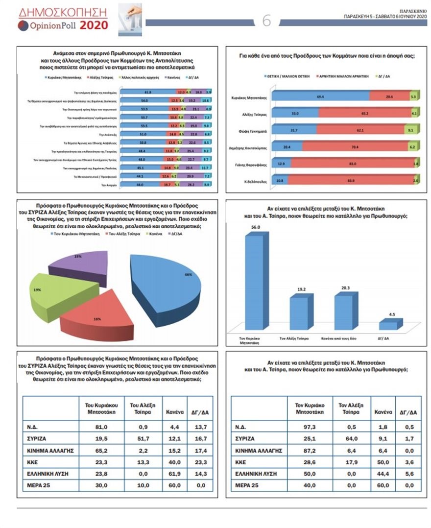 Συγκεκριμένα, το 69,4% έχει θετική γνώμη για τον πρόεδρο της ΝΔ, ενώ το 33% συγκεντρώνει ο πρόεδρος του ΣΥΡΙΖΑ, Αλέξης Τσίπρας. Η Φώφη Γεννηματά λαμβάνει το 31,7%, ενώ ο Δημήτρης Κουτσούμπας του ΚΚΕ συγκεντρώνει το 20,4%, ο Γιάνης Βαρουφάκης το 12,9% και ο Κυριάκος Βελόπουλος το 10,8%