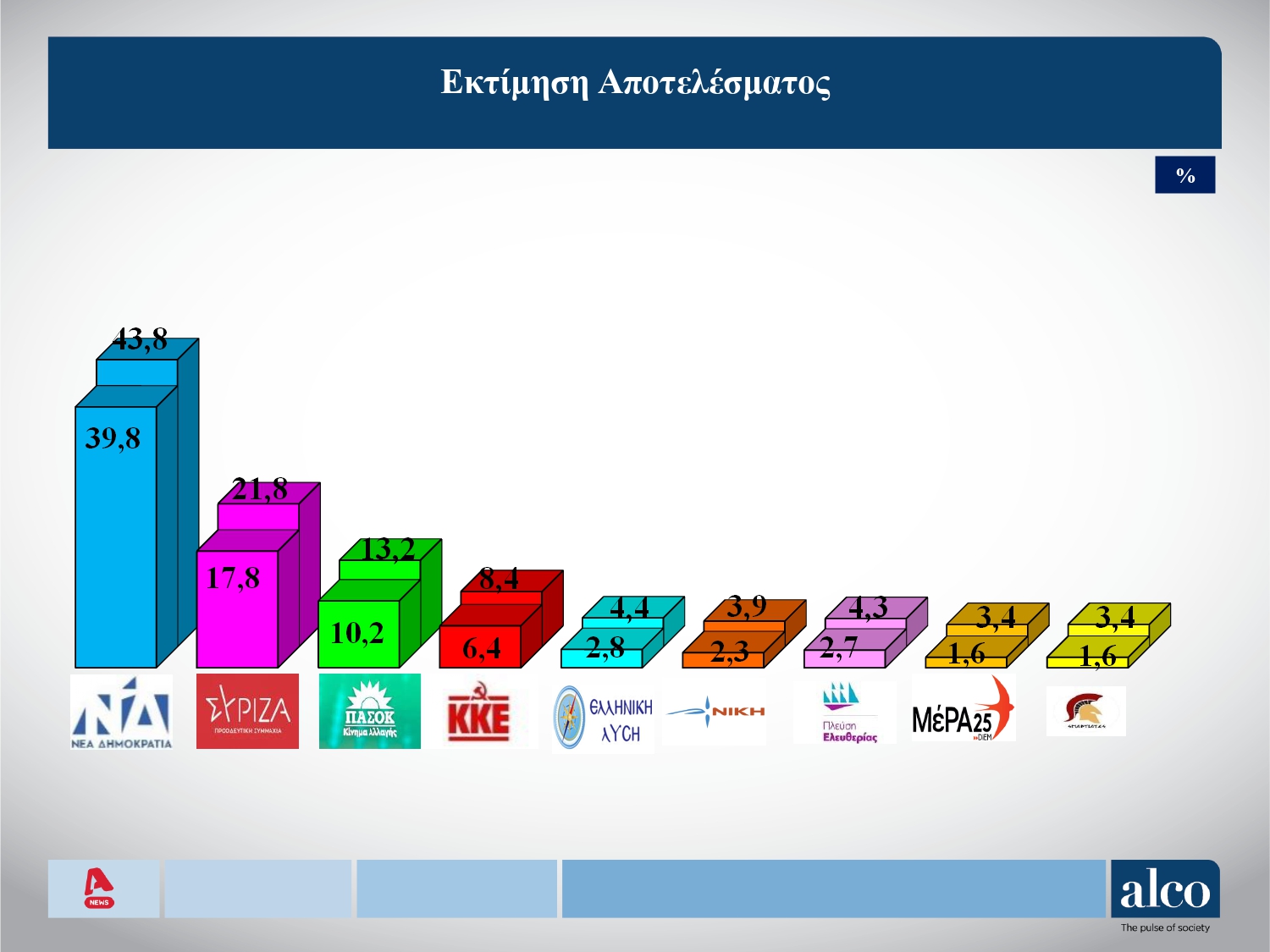 Στην εκτίμηση του εκλογικού αποτελέσματος, το εύρος των ποσοστών των κομμάτων, διαμορφώνεται ως εξής: