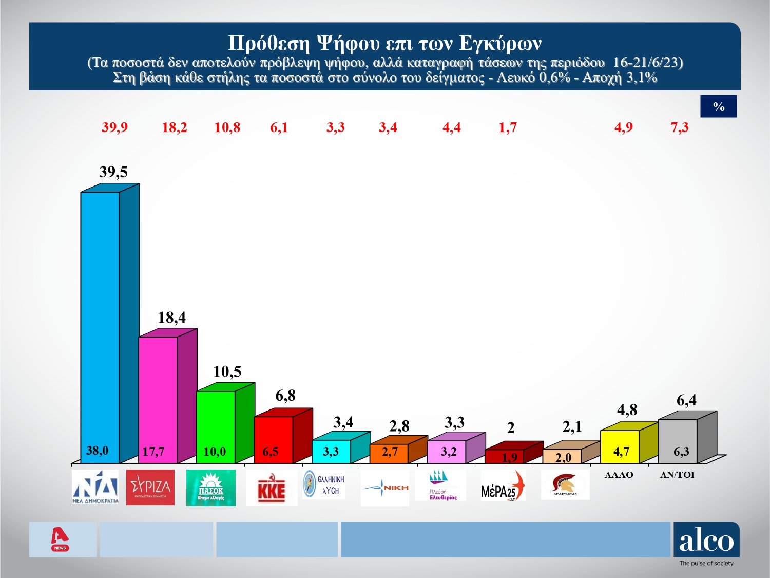 Μία νέα δημοσκόπηση βλέπει το φως της δημοσιότητας, στην τελική ευθεία για τις εκλογές της 25ης Ιουνίου. Σύμφωνα με την έρευνα που διενήργησε η Alco για τον Alpha, στην πρόθεση ψήφου επί των εγκύρων, η Νέα Δημοκρατία διατηρεί προβάδισμα 21,1 μονάδων έναντι του ΣΥΡΙΖΑ. Συγκεκριμένα, η Νέα Δημοκρατία συγκεντρώνει ποσοστό 39,5% έναντι 18,4% του ΣΥΡΙΖΑ.